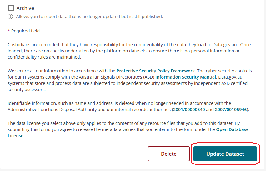 Deleting a dataset will mean that it is no longer available. This may cause disruptions for user applications referencing the dataset.
